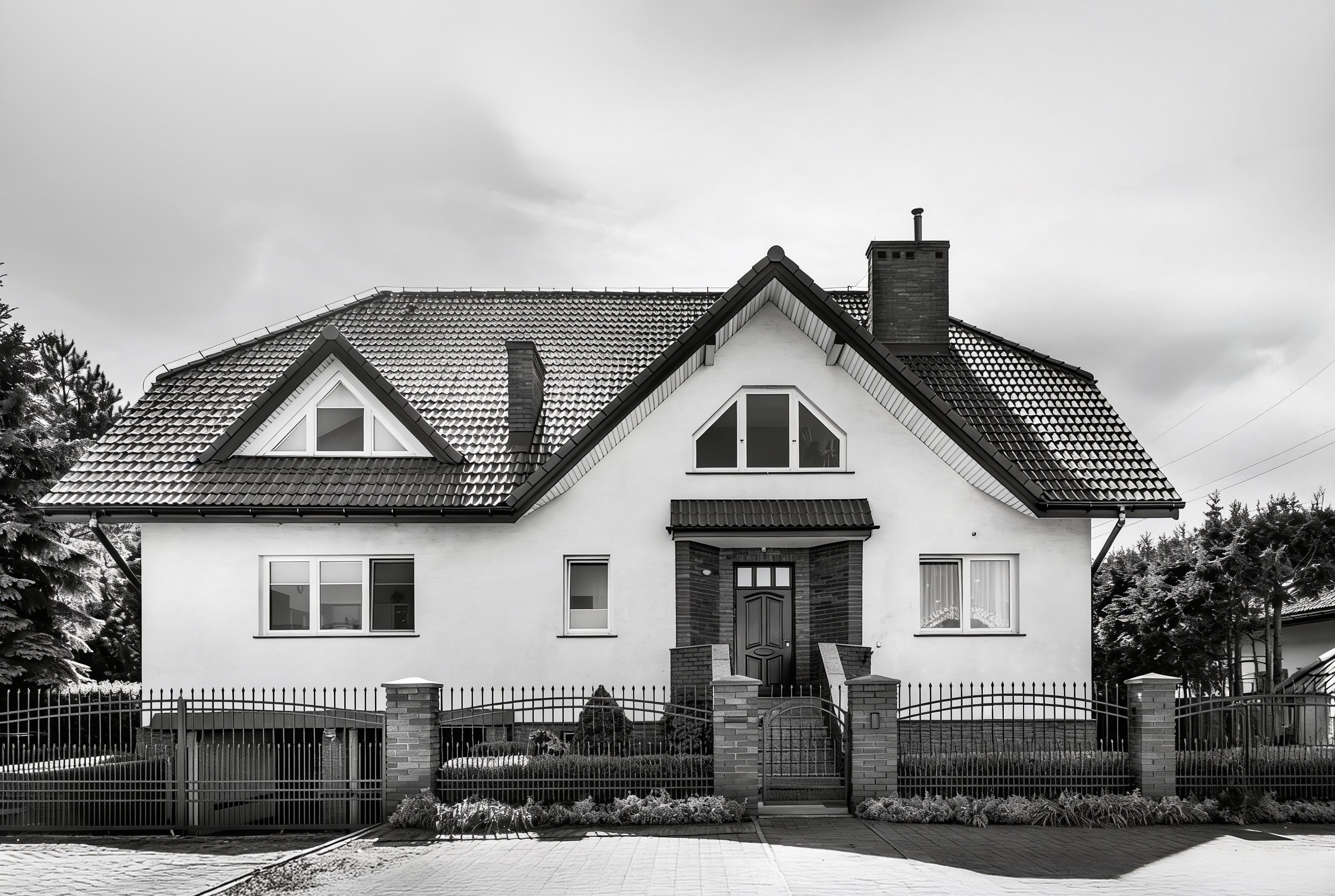 A charming white house features a vibrant red-tiled roof, a prominent brick chimney, and a lush garden with climbing vines and manicured shrubs, embodying countryside elegance and appealing architecture.