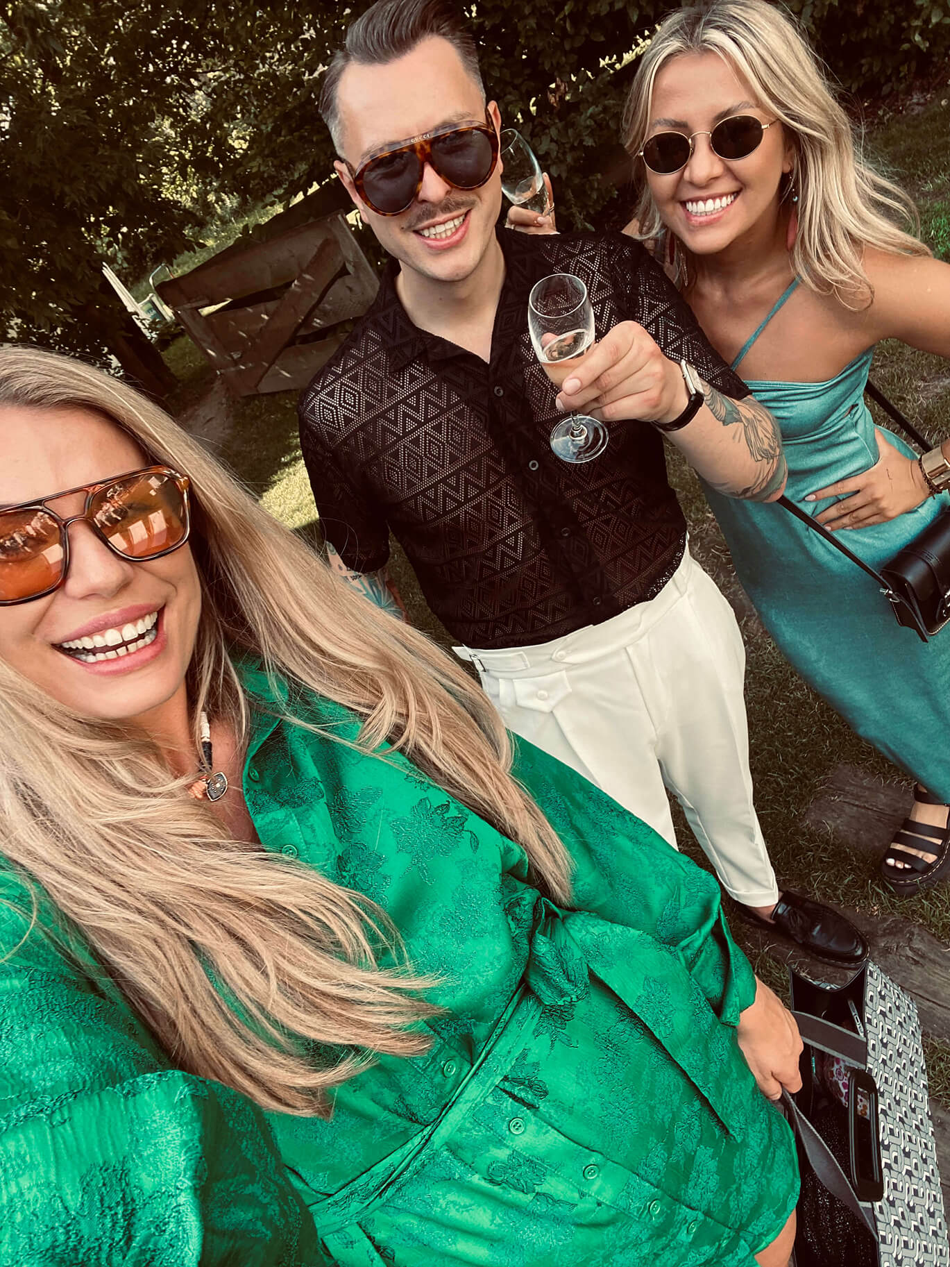 A person with light hair wearing large, modern sunglasses gazes upwards outdoors, with a blurred background of trees and sky, conveying a sense of contemplation and style.