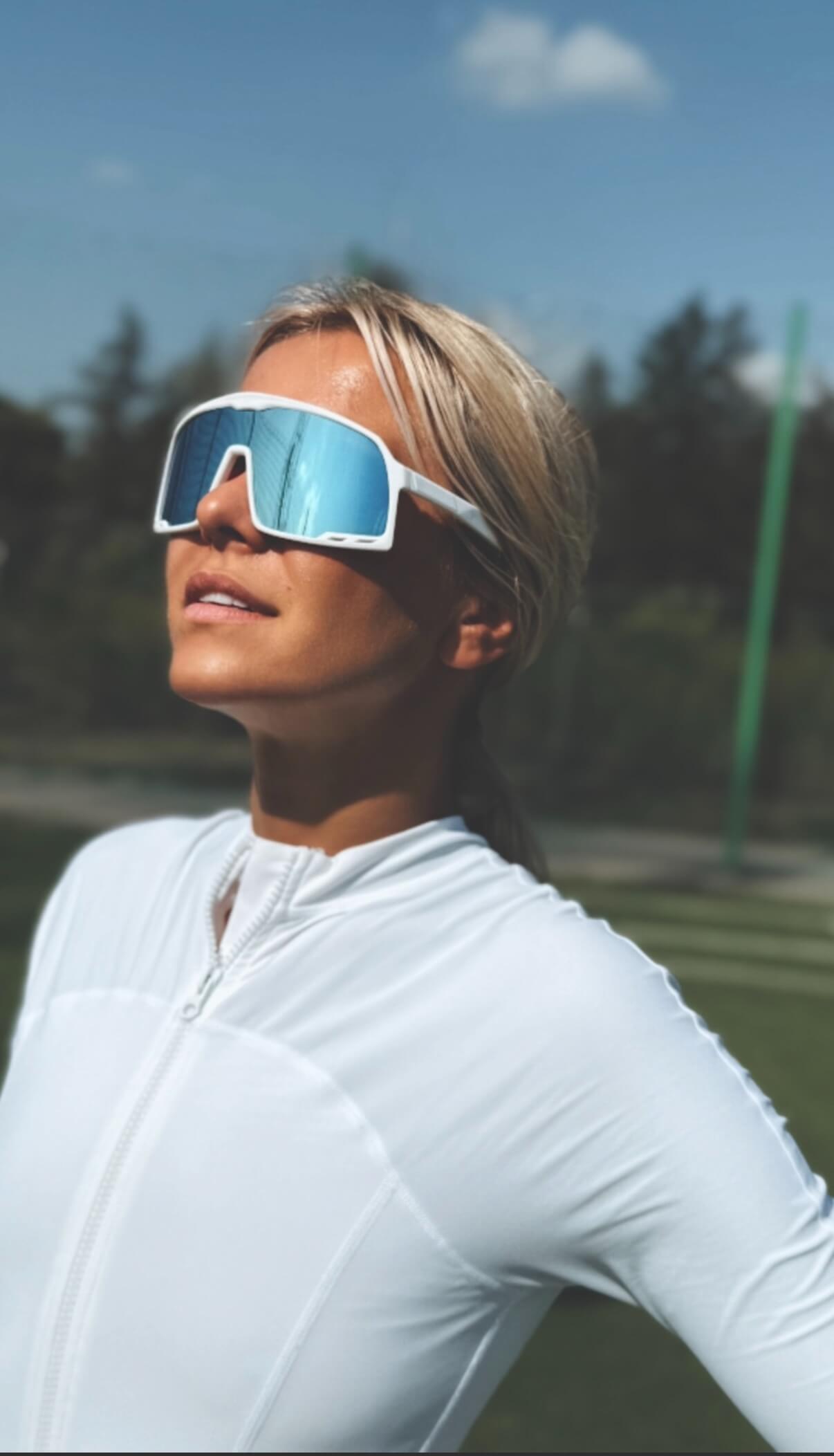 A person wearing reflective sunglasses and a fitted white athletic jacket stands outdoors, basking in the sunlight against a backdrop of a forested area and a clear blue sky.